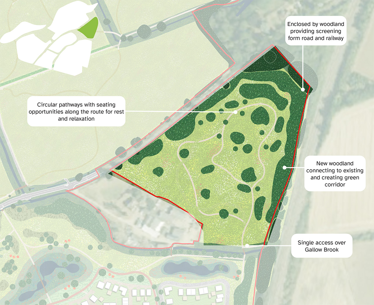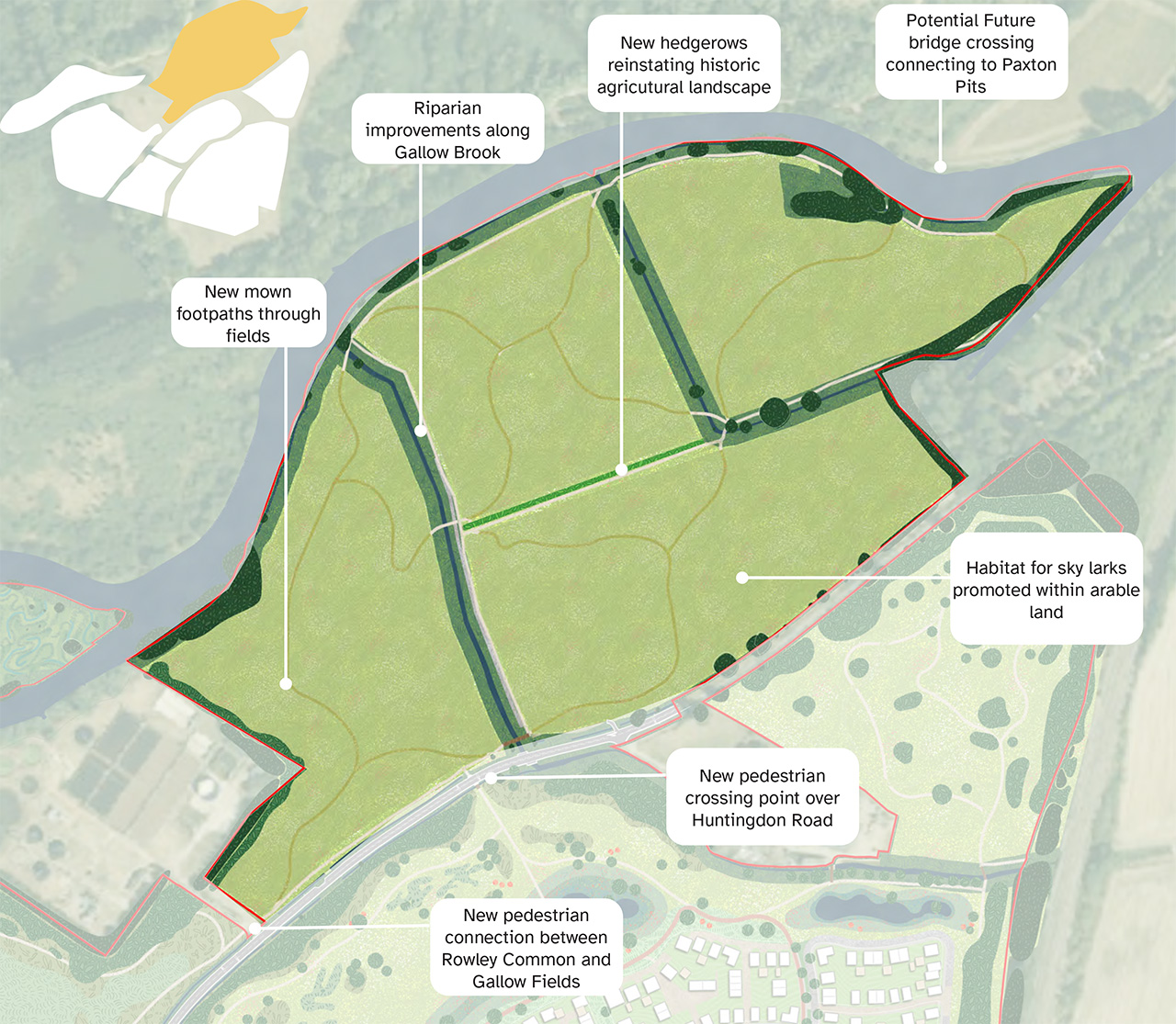 • Brook Meadow lies north of Brook Farm and Gallow Brook, east of Huntingdon Road, and west of the railway, connecting to the wider site via a new rural bridge over Gallow Brook, linking into Hawkesden Leys and the public rights of way network.