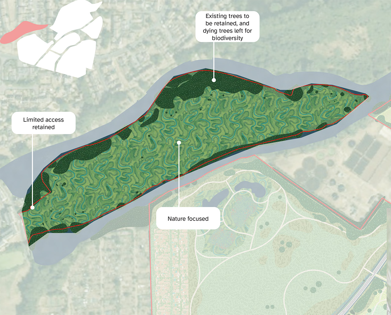 • Paths and boardwalks will wind through the landscape, with sunny west-facing slopes offering views over the valley and river.