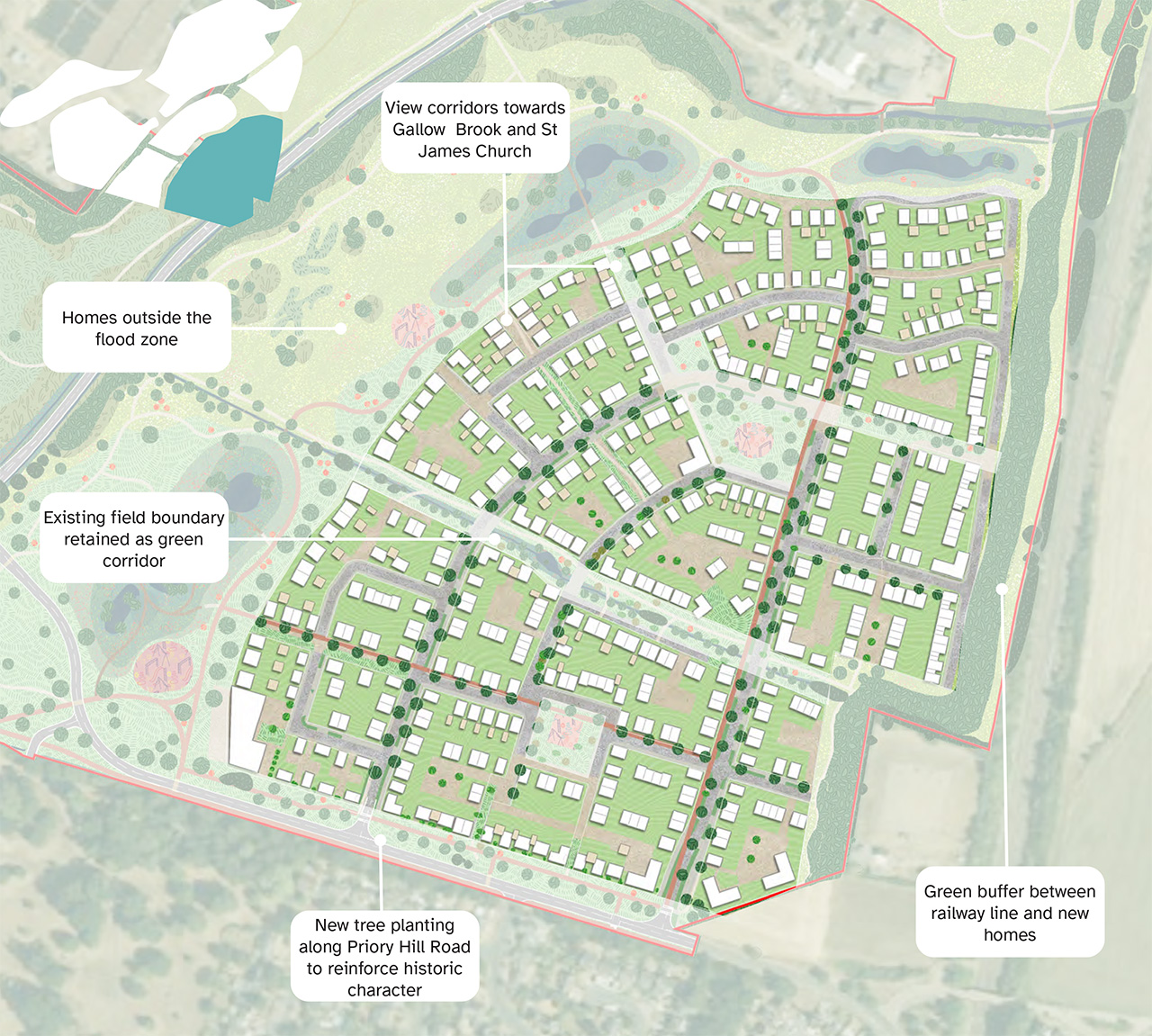 • Development located on higher ground out of the floodplain, with the railway to the east, Gallow Brook to the north, and Priory Hill Road to the south.
