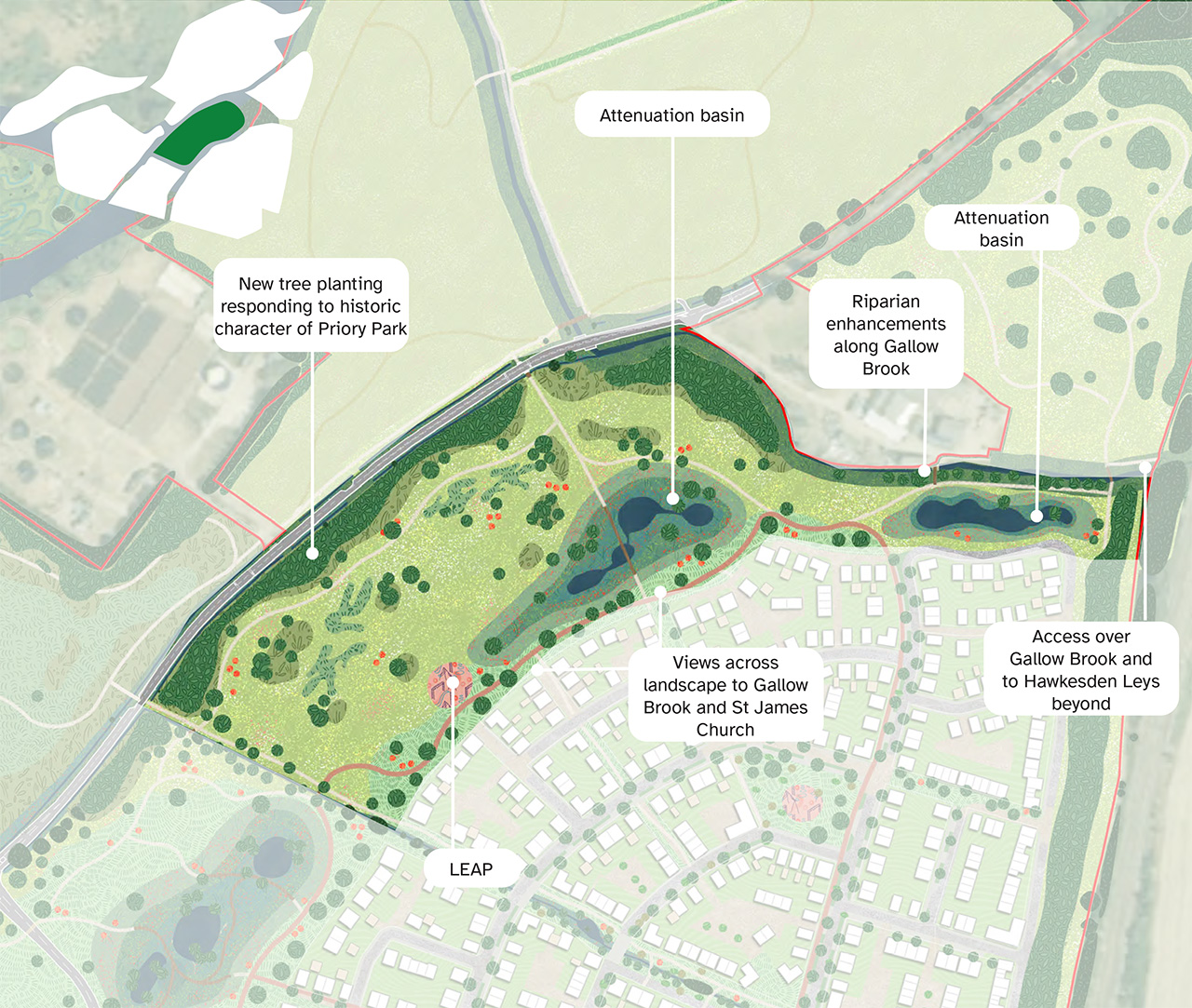 • Green Character with new woodland, hedgerows, and specimen trees will reflect the character of Priory Park and enhance biodiversity.
