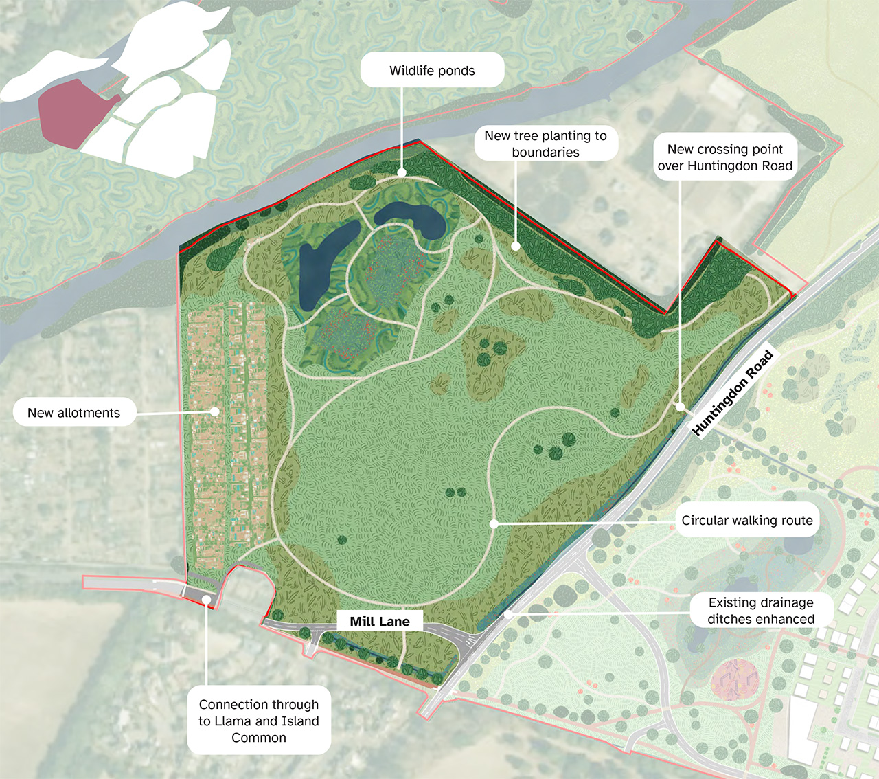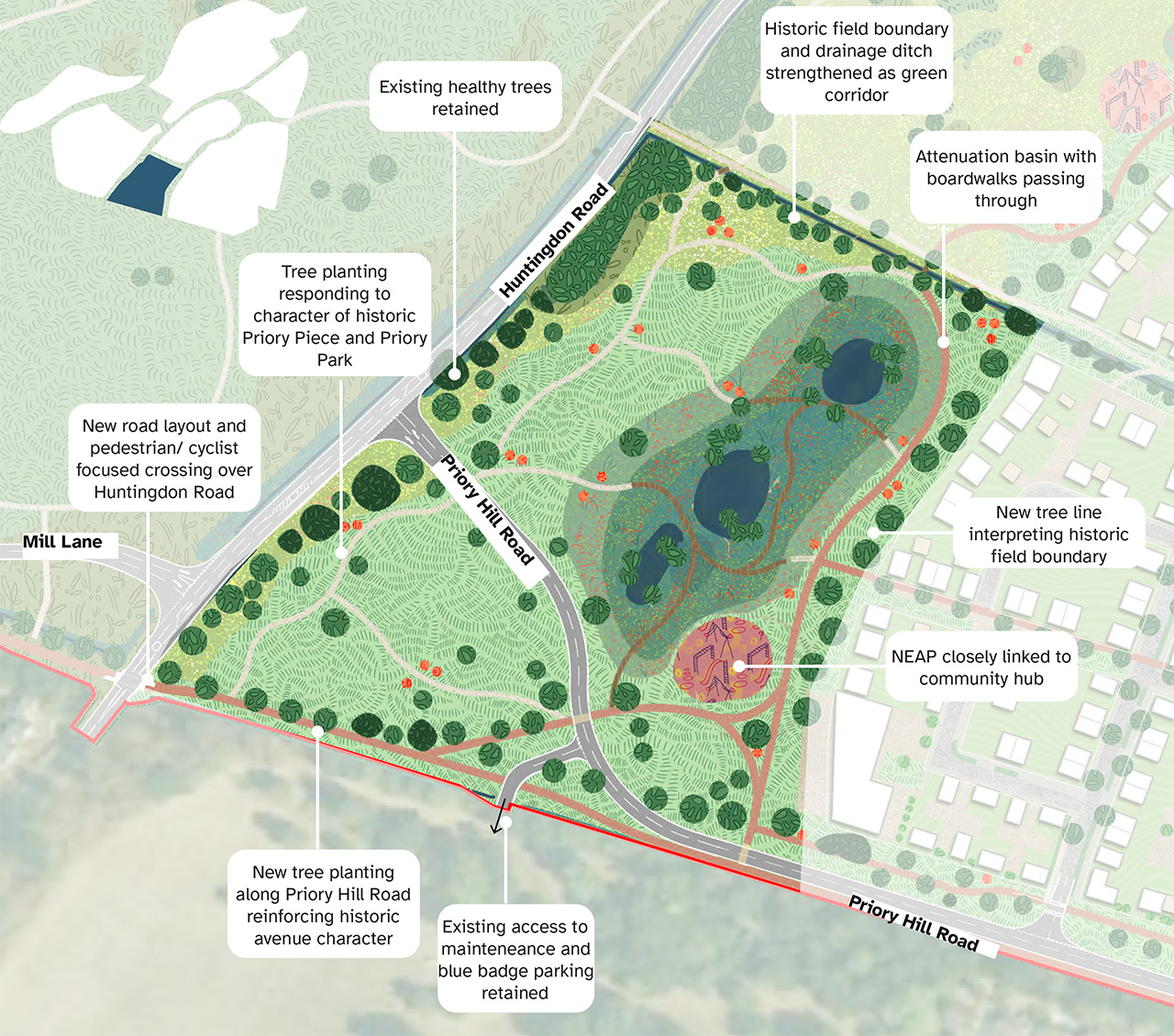 • Gradual transition between formal parkland it will act as a bridge between the more formal Priory Piece and the natural meadows to the north, with a mix of formal and mown seasonal pathways. New crossing points over Huntingdon Road will connect to Gallow Fields, the Common Land, and a proposed bridge to Paxton Pits.